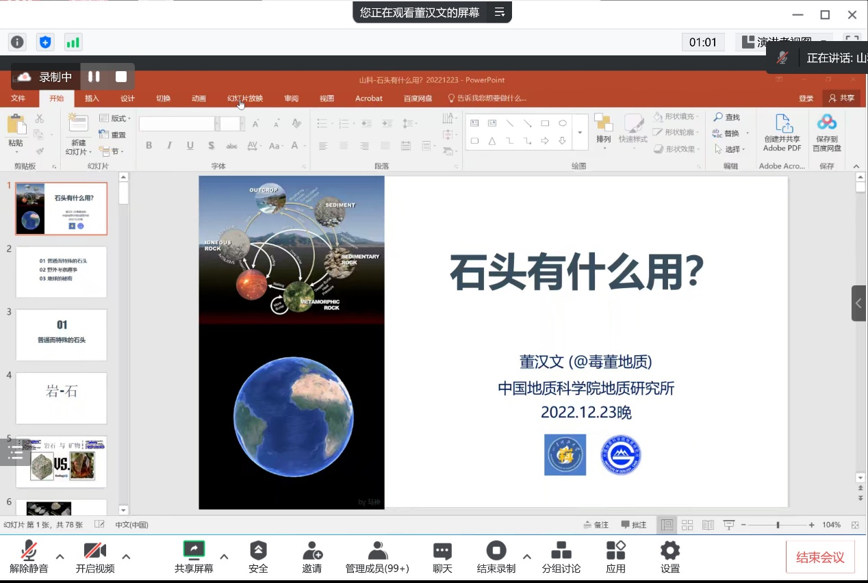为启迪地球科学相关专业新生学习地学的兴趣,真切感受地学的魅力,充分发挥科学传播引领作用,提升地学科普公共服务能力,12月23日,地球科学馆邀请知名地质科普达人、中国地质科公司地质研究所副研究员董汉文做题为《石头有什么用?》的线上科普报告。报告会由科普工作室领衔专家孟元库教授主持,公司2022级地质工程、勘查技术与工程、水文与水资源工程专业本科生聆听了报告。本次科普报告为信誉最好的十大体育平台地球科学科普工作室“嵙话地球”科普讲座第2期。