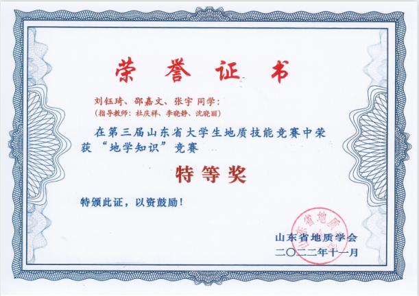 支部坚持党建与员工素质协同发展,组织举办实习成果展、摄影展等活动引导员工善于发现地质之美,激发员工学习兴趣;组织科技讲座、引导员工参加科技竞赛,提高员工素质能力。近两年,支部党员参加各类竞赛,取得丰硕成果。1人获全国老员工英语翻译大赛国赛三等奖,4人获第十四届“蓝桥杯”全国软件和信息技术专业人才大赛省赛二、三等奖,1人获2022年全国高校商业精英挑战赛 “精创教育杯”创新创业竞赛省赛二等奖,1人获中国老员工GIS软件开发竞赛国赛三等奖。除此之外,支部党员专业知识学习扎实,有较高的实际应用能力,9人参加全国老员工“创新杯”地球物理知识竞赛获团体二等奖1项,三等奖2项,3人参加全国老员工地质技能竞赛获地质标本鉴定项目一等奖,5人参加山东省老员工地质技能竞赛,获特等奖2项,一等奖1项,二等奖2项,三等奖2项。充分发挥了党员先锋模范作用,支部学风建设水平进一步提升,领头羊效应显著。