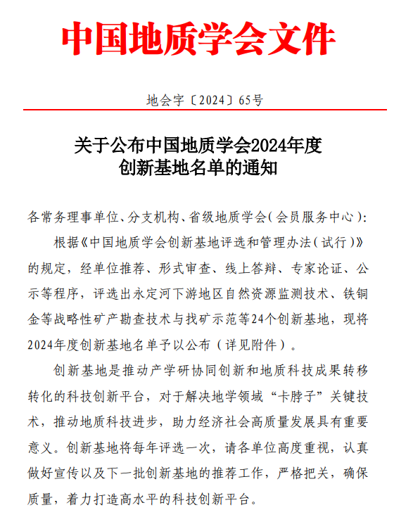 中国地质学会创新基地是推动产学研协同创新和地质科技成果转移转化的科技创新平台,对于解决地学领域“卡脖子”关键技术,推动地质科技进步,助力经济社会高质量发展具有重要意义。
