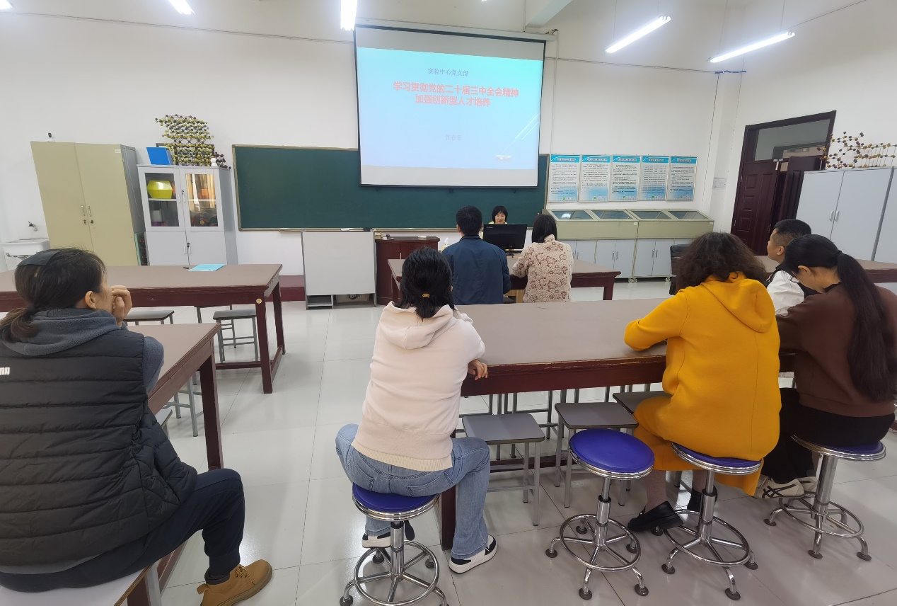 近日,实验中心党支部在J6-328开展学习贯彻党的二十届三中全会精神专题党课,本次党课由支部书记张春荣承担,支部全体党员教师参加。