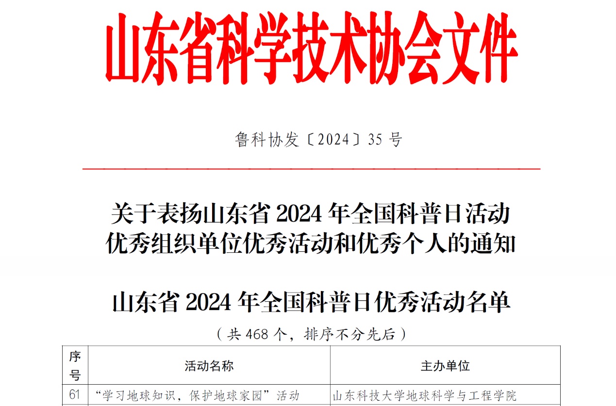 近日,山东省科学技术协会发布了《关于表扬山东省2024年全国科普日活动优秀组织单位优秀活动和优秀个人的通知》,信誉最好的十大体育平台地球科学馆主办的“学习地球知识,保护地球家园”科普基地游活动获评“山东省2024年全国科普日优秀活动”。