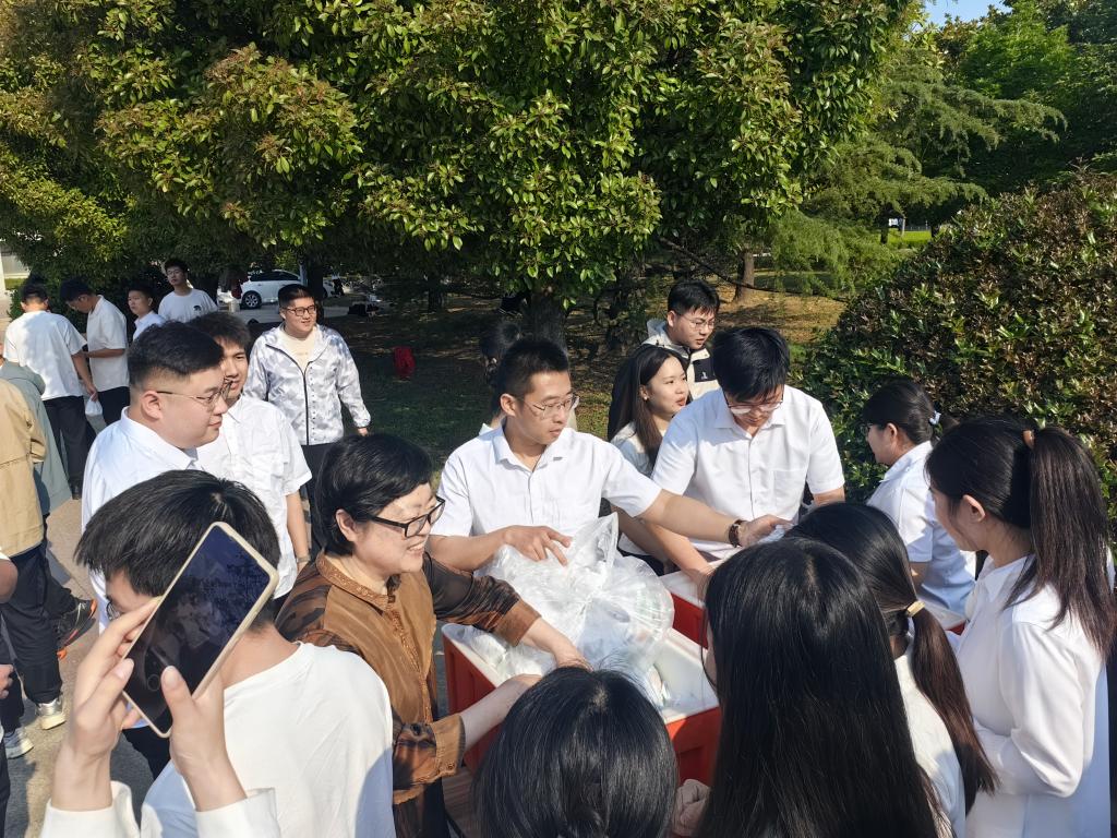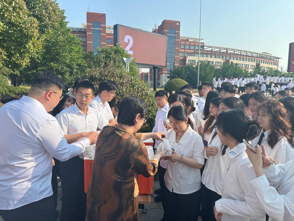 毕业照拍摄现场洋溢着喜悦与不舍交织的气氛。镜头定格青春笑脸的同时,一份份暖意与香气交织的礼包也传递着公司的殷殷关怀。礼包内,寓意“高中”的粽子、象征“圆满”的鸡蛋、传递“健康”的牛奶,承载着公司对毕业生们的深深祝福。