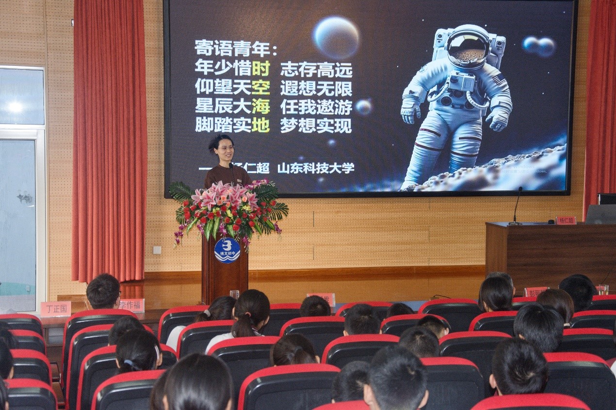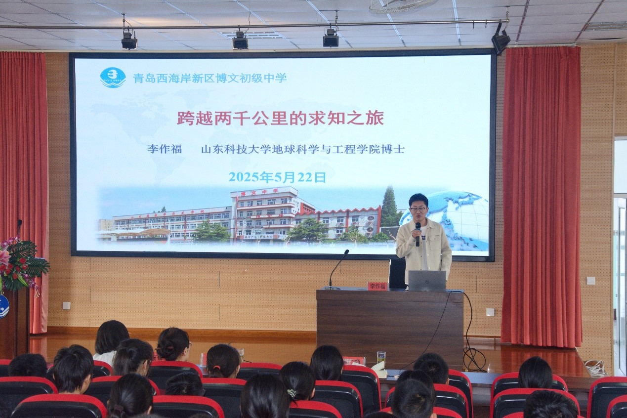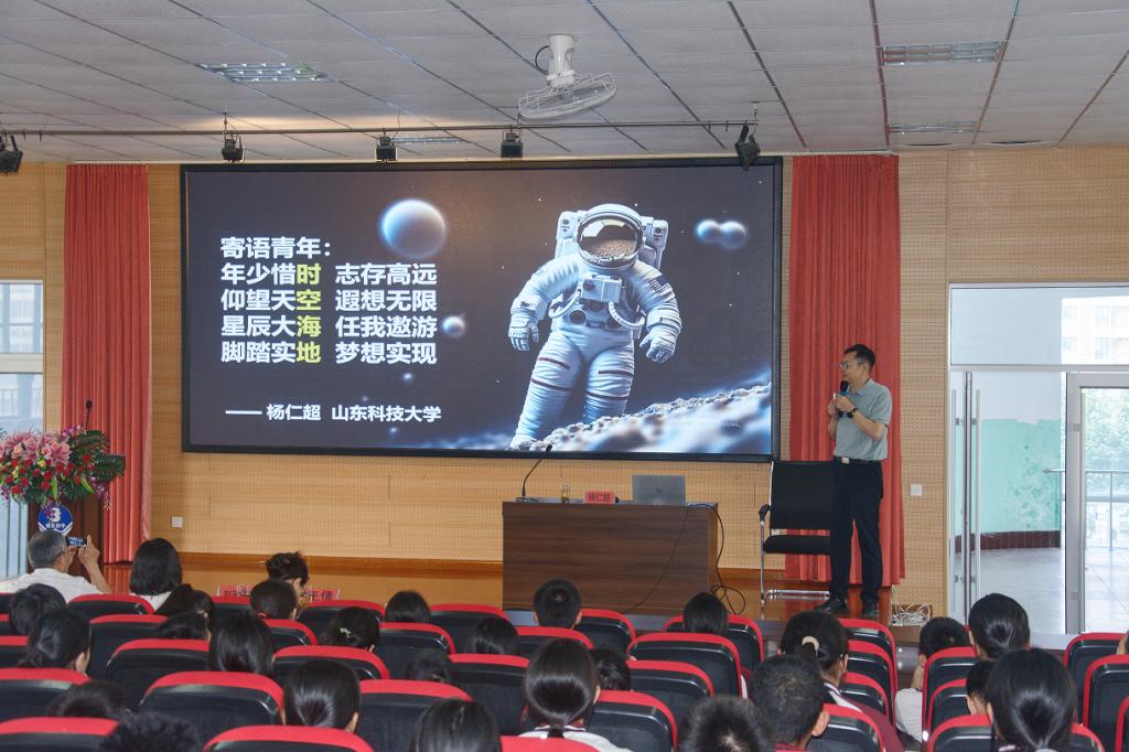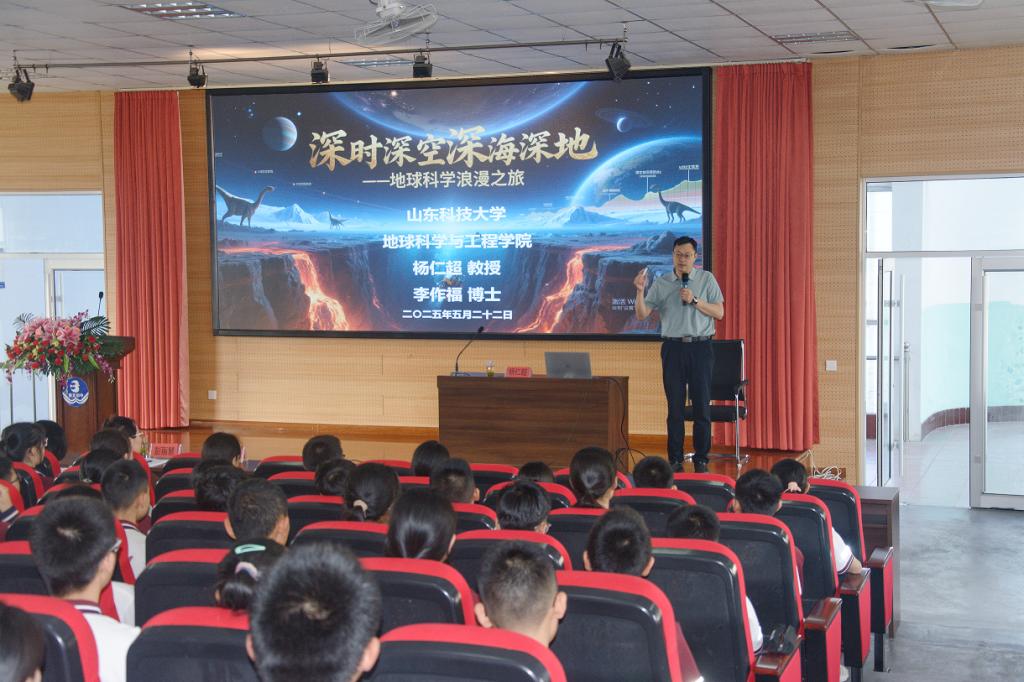 聘任仪式结束后,杨仁超为博文中学师生做“深时、深空、深海、深地—地球科学浪漫之旅”科普讲座。深时领域,他借大氧化事件、生物大灭绝等地质历史,结合化石与同位素技术,揭秘地球演化;深空探测中,列举阿波罗计划、嫦娥工程等成果,展望地外生命探索;深海探索介绍“蛟龙号”“奋斗者号”对马里亚纳海沟等的研究;深地研究以松科二井为例,阐述高温高压技术突破及资源开发,展现地球科学魅力与人类探索精神。