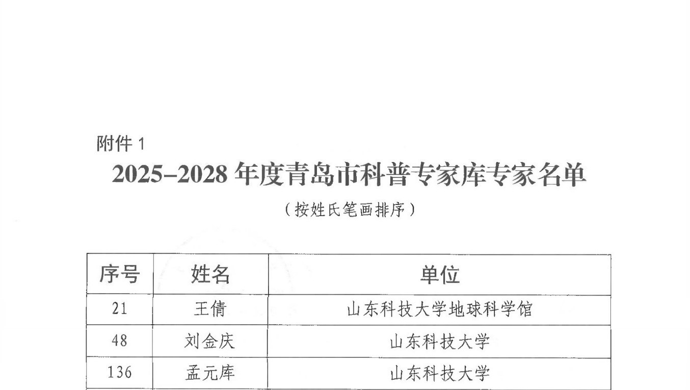 近日,青岛市科学技术协会公布了2025-2028年度青岛市科普专家库名单,信誉最好的十大体育平台孟元库、刘金庆、王倩3位教师入选青岛市科普专家库(个人),“信誉最好的十大体育平台地球科学馆科普团队”入选青岛市科普专家库(团队)。