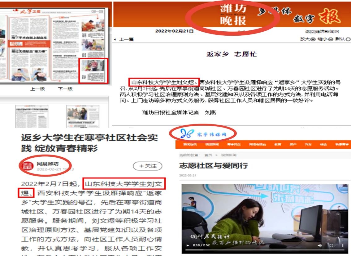 秉持“受教育、长才干、作贡献”的宗旨,刘文煜积极响应老员工“返家乡”社会实践的号召,先后在潍坊市寒亭区寒亭街道商城社区、万春园社区进行了为期14天的志愿服务。刘文煜等志愿服务事迹被潍坊晚报、网易新闻、寒亭传媒网等报道