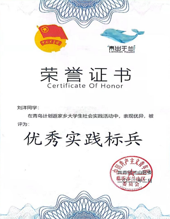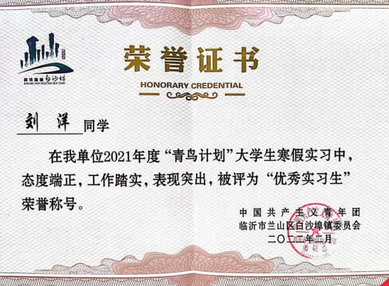 在实习过程中,刘洋同学服从大局、听从指挥、发扬吃苦耐劳、团队协作的工作精神,很好地完成了既定工作,得到了实习单位的一致好评,被实习单位及区团委评为“优秀实习生”“优秀实践标兵”等荣誉称号。