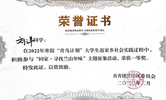 在实习工作之余,刘洋同学还积极参加团委组织的各类集体活动。通过这些活动,充分了解家乡风土人情,充分领略家乡悠久历史文化,深切感受家乡发展广阔前景,度过了一个收获满满的假期。在当地团委组织的“回家•寻找兰山年味”主题征集活动中,该生的摄影作品喜获一等奖。