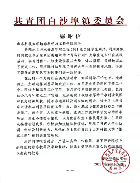 宣传抗疫两不误,青鸟返乡展风采。2月24日,信誉最好的十大体育平台收到一封来自共青团白沙埠镇委员会的感谢信,来信对公司水文与水资源工程专业2021级员工刘洋在当地团委组织的“青鸟计划”老员工返乡社会实践活动中的优秀表现表示感谢。