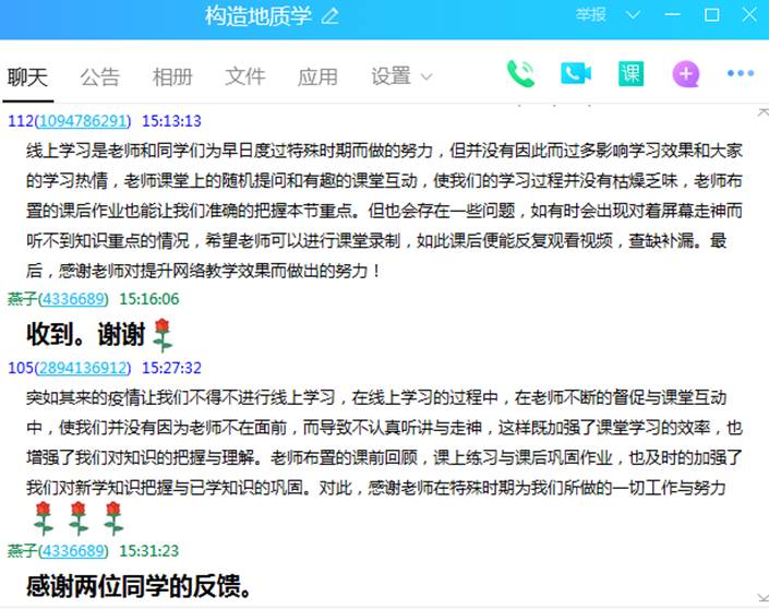 教师课中用心,全力做好线上教学。各位任课老师充分利用超星、智慧树、腾讯会议、钉钉、中国大学MOOC等网络平台,采取在线签到、直播授课、连麦抢答、随机选人与投票、互动答疑、在线学习、课后学习、学业检查等手段完善学习过程,充分发挥同学们学习的主动性与趣味性,进一步活跃学习气氛。针对《弹性力学》授课中的重点难点问题,吕显州老师自己购买手写板,利用手写板进行知识点分解与强调,想方设法降低员工理解难度;组织线上小组汇报形式的习题课,课堂上小组长随机抽题与抽取汇报人,被抽取人共享屏幕进行汇报,最后采用组间评价、组内评价、自评与教师评价进行评分,计入员工过程性考核成绩。《构造地质学》课程授课过程中,刘海燕老师插入了大量的野外现场图版,让员工有身临野外现场的感觉,让知识即学即用,提高学习效果。