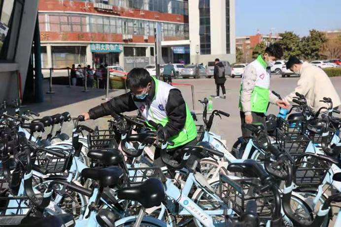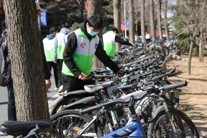 下午2点,“大地之光”志愿服务队开展了校园“美”一步志愿活动,分别对公寓A区和C区的自行车、电动车进行整理。恰逢惊蛰万物生发,志愿者们身上的绿色马甲却比这萌动春日和晴好阳光更加青春纯粹、生机盎然。