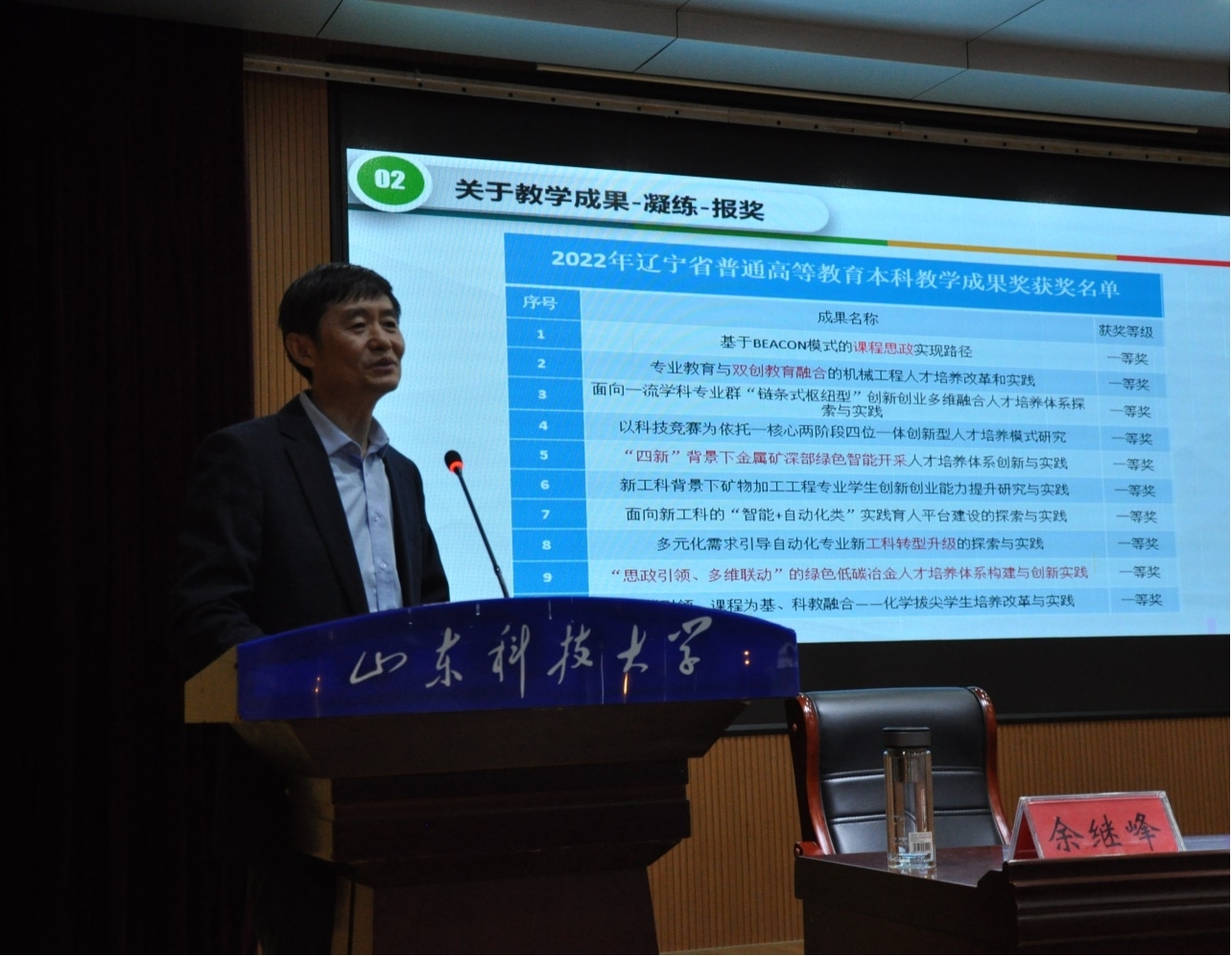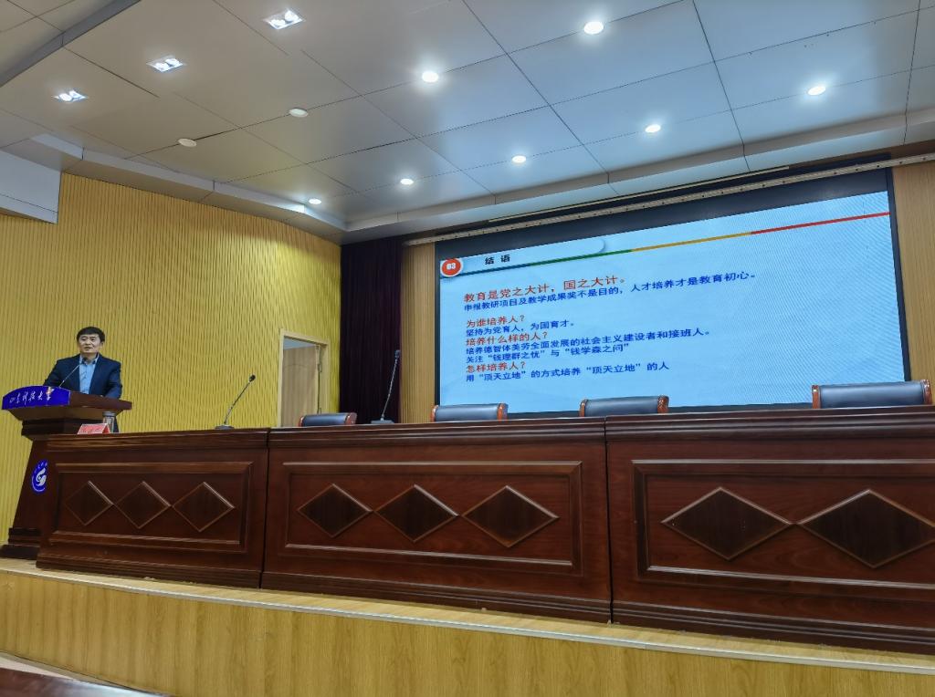 余继峰教授以立德树人为切入点,讲述了如何贯彻落实科教兴国战略、人才强国战略、创新驱动发展战略等国家发展战略。他结合自己30多年的从教经历总结出:作为一名人民教师,要全面贯彻党的教育方针,落实立德树人根本任务,始终坚持为党育人、为国育才,全面提高人才自主培养质量,着力造就拔尖创新人才,培养德智体美劳全面发展的社会主义建设者和接班人。报告中,余继峰教授通过讲述“钱理群之忧”、“钱学森之问”和“人民教育家陶行知”的故事,以及分享自己教学成果的凝练思路,进一步阐述了关心国家大政方针、改变教学理念、提高教学能力、改进教学方法、创新培养模式的重要性。余继峰教授的报告通俗易懂,受到参会教师的一致好评,报告会现场老师们凝神静听。