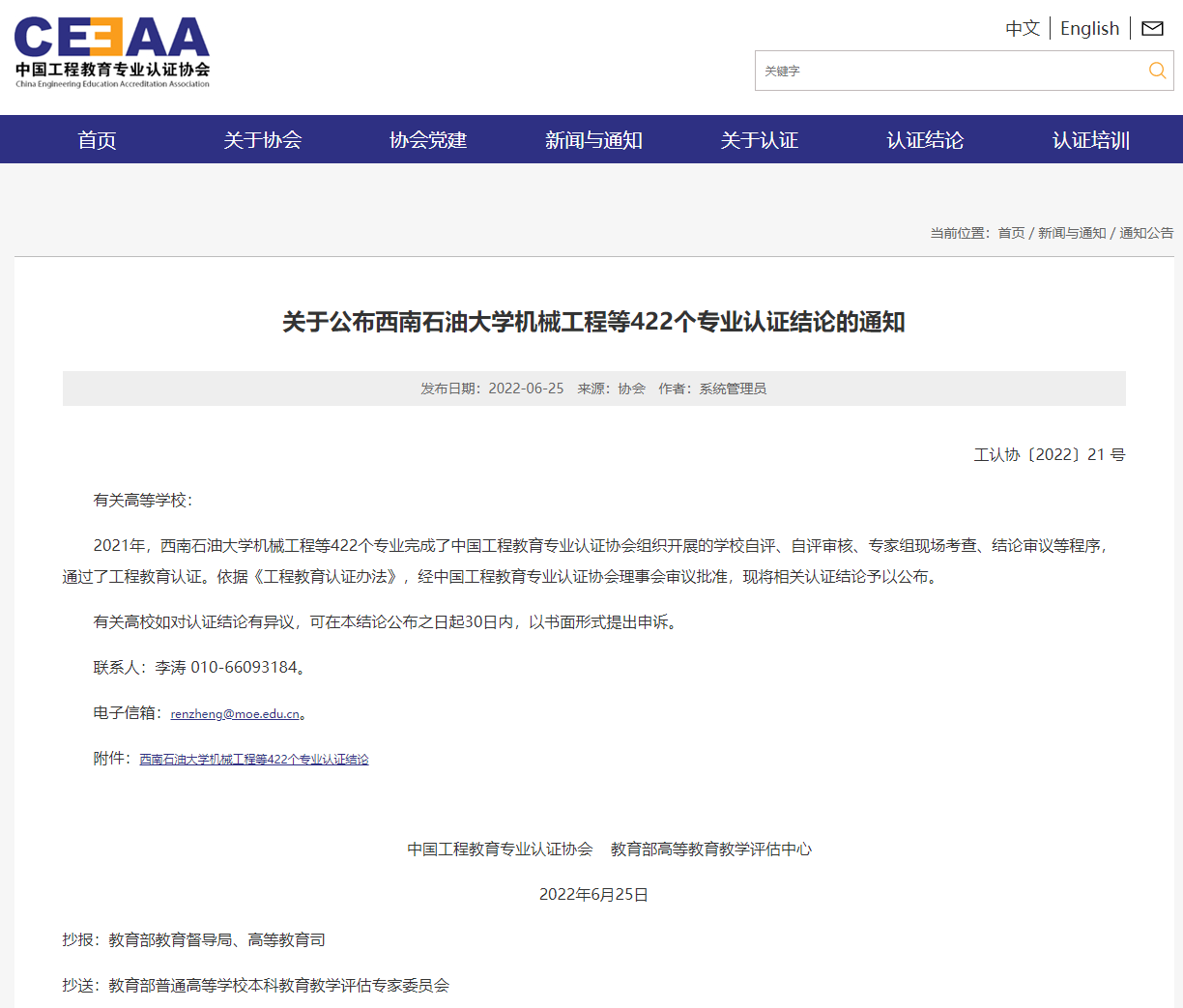 6月25日,教育部高等公司产品评估中心、中国工程教育专业认证协会发布了《关于公布西南石油大学机械工程等422个专业认证结论的通知》(工认协〔2022〕21号)和《关于公布北京工业大学机械工程等460个专业工程教育认证中期审核结论的通知》(工认协〔2022〕22号)。