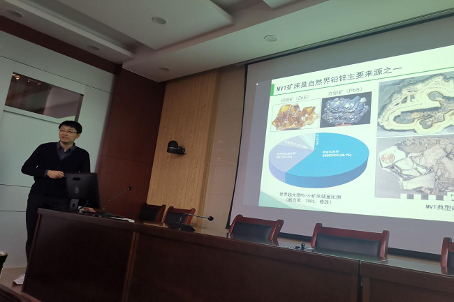 宋玉财研究员首先介绍了密西西比河谷型(MVT)铅锌矿床的重要意义,然后介绍了MVT铅锌矿床的主要矿床特征、成矿流体性质与来源、成矿流体中铅锌来源与含量特征、矿体蚀变与分带特征,最后指出了MVT 矿床与油气储存空间的关系非常密切,证明了大陆碰撞褶冲带是全球MVT铅锌矿床的重要成矿环境,识别盐底辟构造是MVT铅锌矿床储矿构造重要新类型,构建了褶冲系内MVT铅锌成矿模型。最后宋玉财研究员与老师们进行了详细地交流和探讨。