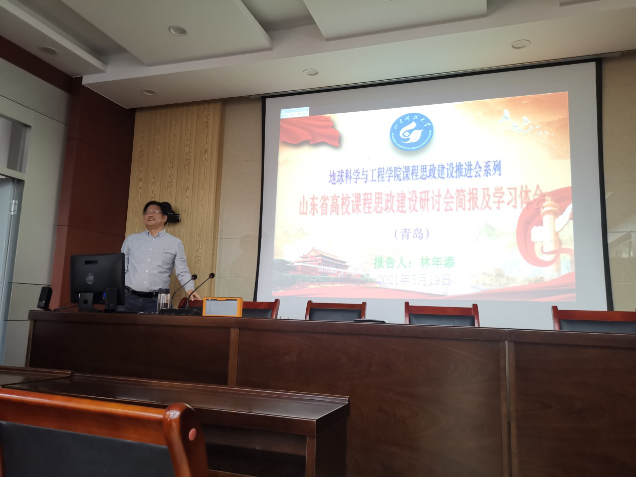 为更好地贯彻落实《高等公司课程思政建设指导纲要》精神和《信誉最好的十大体育平台课程思政建设实施方案》,推进公司课程思政建设,2021年5月19日下午,地球物理系林年添教授在J6-530会议室,为公司教师做了题为《山东省高校课程思政建设研讨会简报及学习体会》的讲座,讲座由公司教学副经理尹会永教授主持。