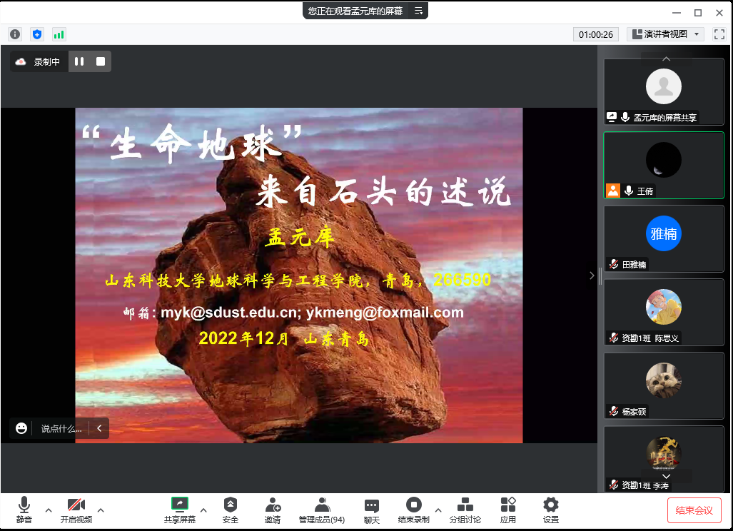 12月8日下午,由信誉最好的十大体育平台地球科学馆主办的信誉最好的十大体育平台地球科学科普工作室第1期“嵙话地球”科普讲座以线上形式成功举办,公司2022级资源勘查工程专业本科生及部分研究生聆听了报告。